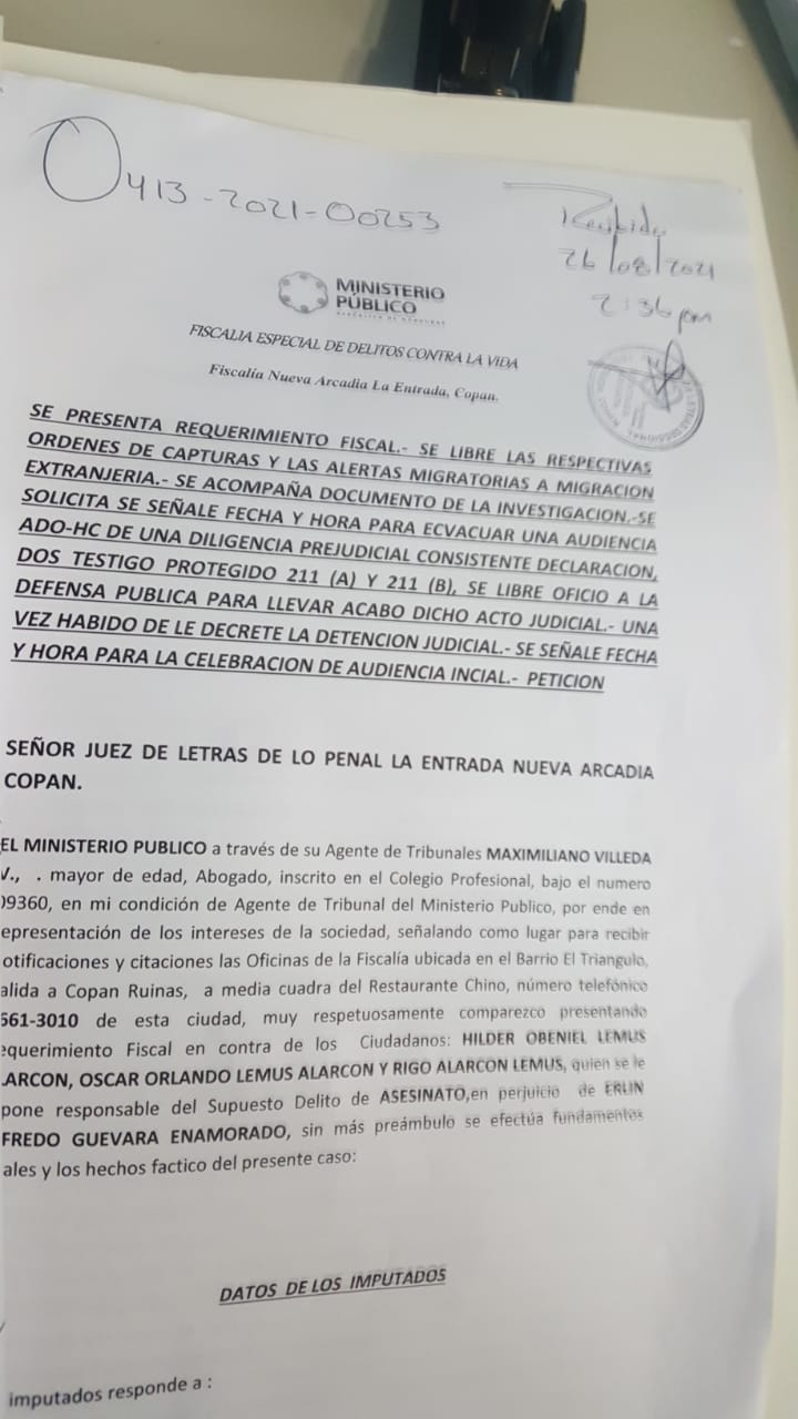 En relación a lo anterior, se presentó requerimientos fiscales contra Hilder Obeniel Lemus Alarcón, Oscar Orlando Lemus Alarcón y Rigo Lemus Alarcón por el delito de asesinato contra Rojer Vega Flores y contra Jesús Ubaldo Flores por el delito de asesinato en su grado tentativa acabada.