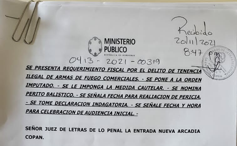 En lo que respecta a la Fiscalía de la Entrada Copán, en la audiencia inicial que se realizó contra el señor Edilson Eduardi Flores Mata por delito de porte ilegal de arma de fuego y contra Maritza Granados Ramos por el delito de falso testimonio, en ambos casos se logró auto de formal procesamiento con medidas distintas a la prisión.