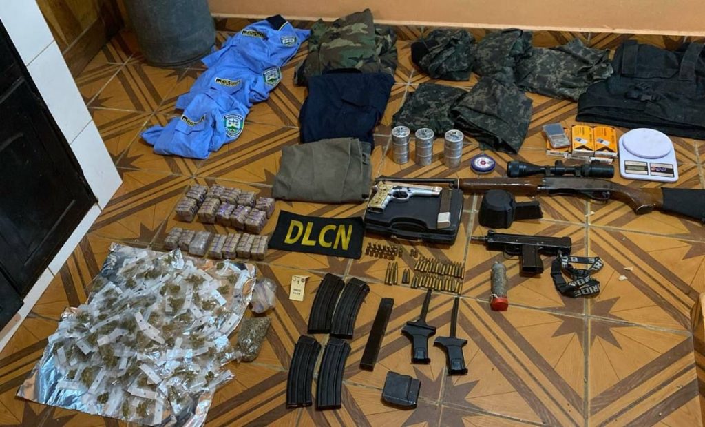 Además, se embalaron 60 gramos de supuesto Cristal (MDA), indumentaria policial y militar, chalecos antibalas, tres armas de fuego, munición, una ametralladora UZI M11/ninemm, incorporated Atlanta, GA-USA, un fusil color café con la leyenda Hamilton, serie B7177014.