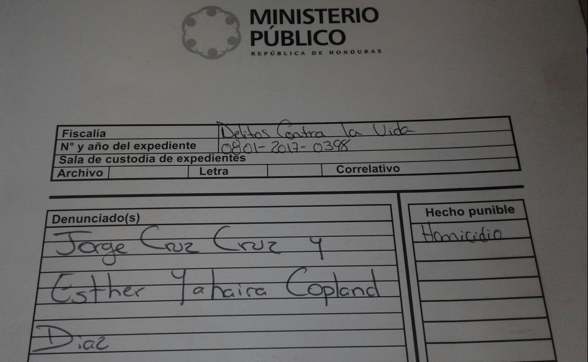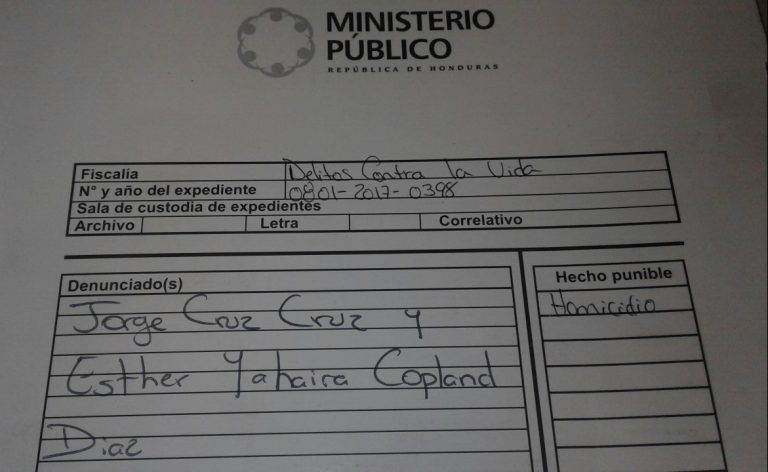 Tegucigalpa. Francisco Morazán. La Fiscalía Especial de Delitos Contra la Vida (FEDCV), a través de la Sección de Investigación de Muertes Violentas de Mujeres y Femicidios, obtuvo en las últimas horas Auto de Formal Procesamiento y Prisión Preventiva en contra de Jorge Cruz Cruz y Esther Yahaira Coplan Díaz, por suponerlos responsables a título de autor del delito de Asesinato en perjuicio de Gellen Baleska Molina.