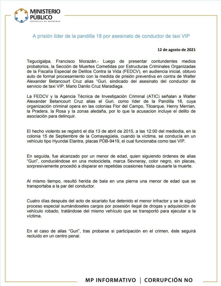 Tegucigalpa, Francisco Morazán.- Luego de presentar contundentes medios probatorios, la Sección de Muertes Cometidas por Estructuras Criminales Organizadas de la Fiscalía Especial de Delitos Contra la Vida (FEDCV), en audiencia inicial, obtuvo auto de formal procesamiento con la medida de prisión preventiva en contra de Walter Alexander Betancourt Cruz alias “Guri, sindicado del asesinato del conductor de servicio de taxi VIP, Mario Danilo Cruz Maradiaga.