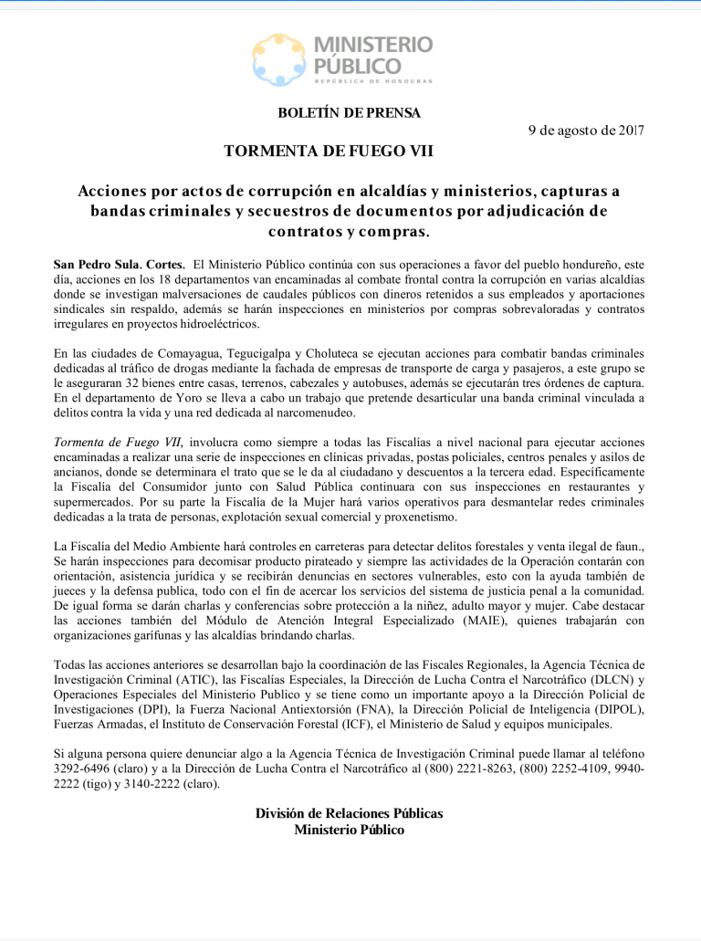 San Pedro Sula. Cortes. El Ministerio Público continúa con sus operaciones a favor del pueblo hondureño, este día, acciones en los 18 departamentos van encaminadas al combate frontal contra la corrupción en varias alcaldías donde se investigan malversaciones de caudales públicos con dineros retenidos a sus empleados y aportaciones sindicales sin respaldo, además se harán inspecciones en ministerios por compras sobrevaloradas y contratos irregulares en proyectos hidroeléctricos.