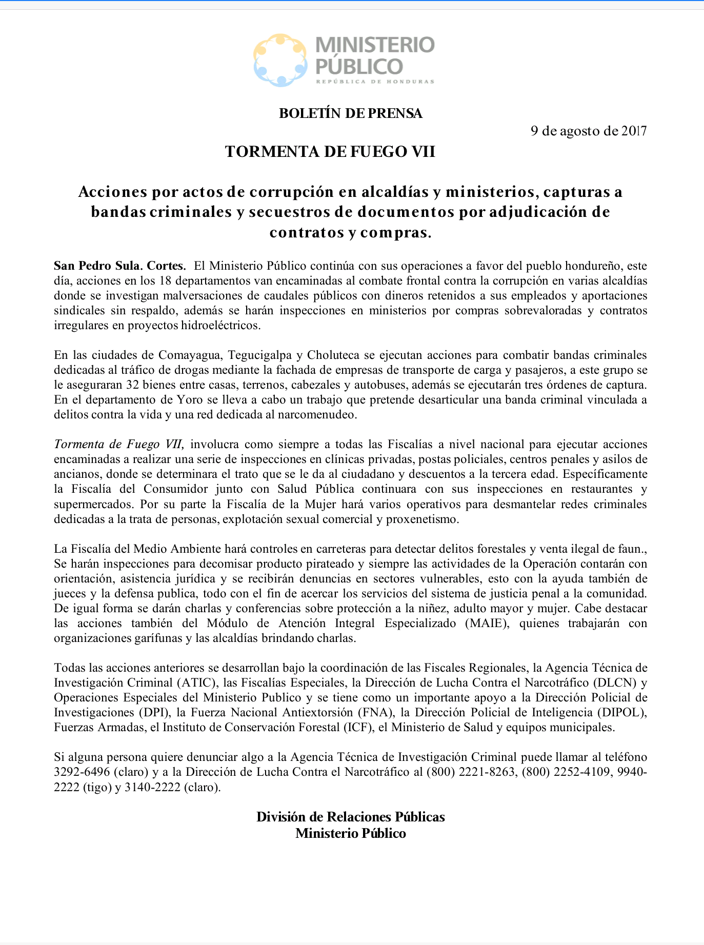 Si alguna persona quiere denunciar algo a la Agencia Técnica de Investigación Criminal puede llamar al teléfono 3292-6496 (claro) y a la Dirección de Lucha Contra el Narcotráfico al (800) 2221-8263, (800) 2252-4109, 9940-2222 (tigo) y 3140-2222 (claro).