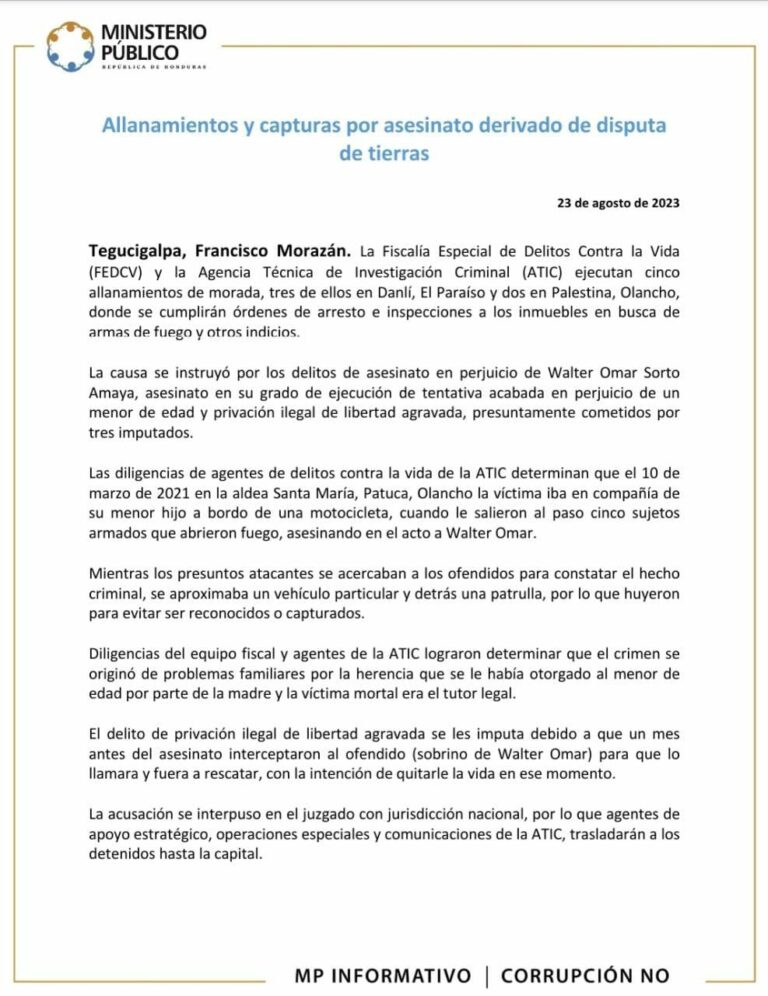 Las diligencias de agentes de delitos contra la vida de la ATIC determinan que el 10 de marzo de 2021 en la aldea Santa María, Patuca, Olancho, la víctima iba en compañía de su menor hijo a bordo de una motocicleta, cuando le salieron al paso cinco sujetos armados que abrieron fuego, asesinando en el acto a Walter Omar.