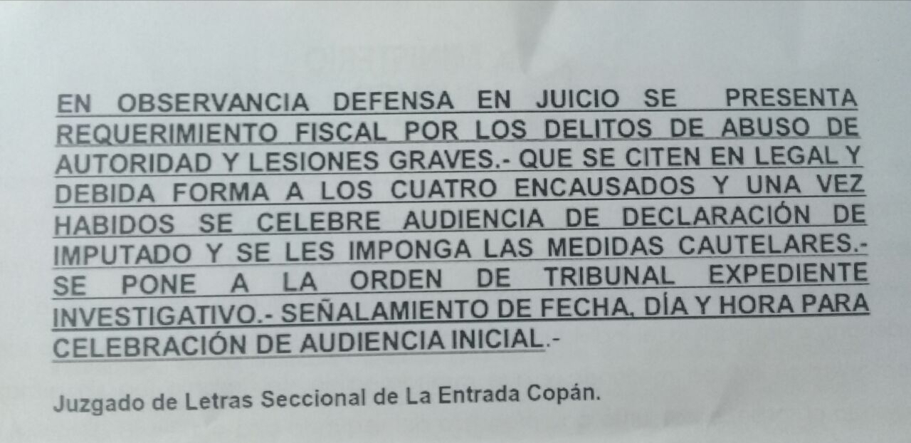 Ante estos abusos, la Fiscalía de Derechos Humanos inició diligencias investigativas en este caso, por lo que se presentó Requerimiento Fiscal contra los cuatro agentes de la FNA en los Juzgados de Letras Seccional de La Entrada Copán y posteriormente se les dictó Auto de Formal Procesamiento.