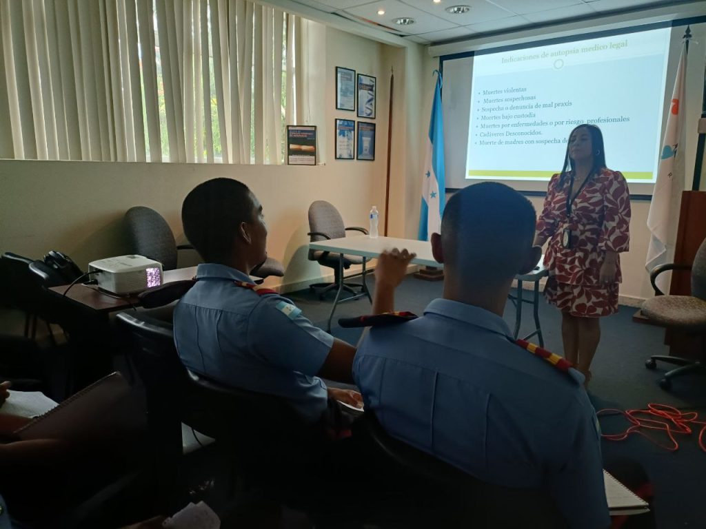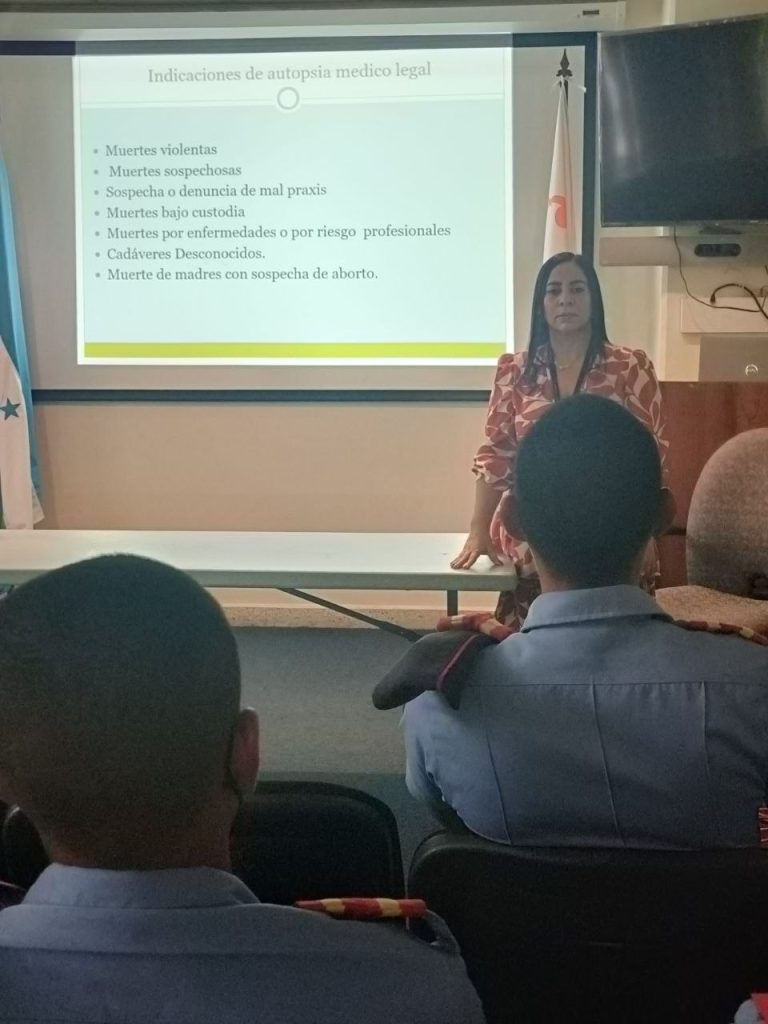 Tegucigalpa, Francisco Morazán. – Cadetes del segundo año de la Academia Nacional de Policía (ANAPO) tuvieron una jornada de capacitación en las instalaciones del Centro de Ciencias Forenses del Ministerio Público (MP) durante la cual escucharon las exposiciones de galenos asignados al Departamento de Patología Forense y la Unidad de Identificación Humana entre otras instancias especializadas.