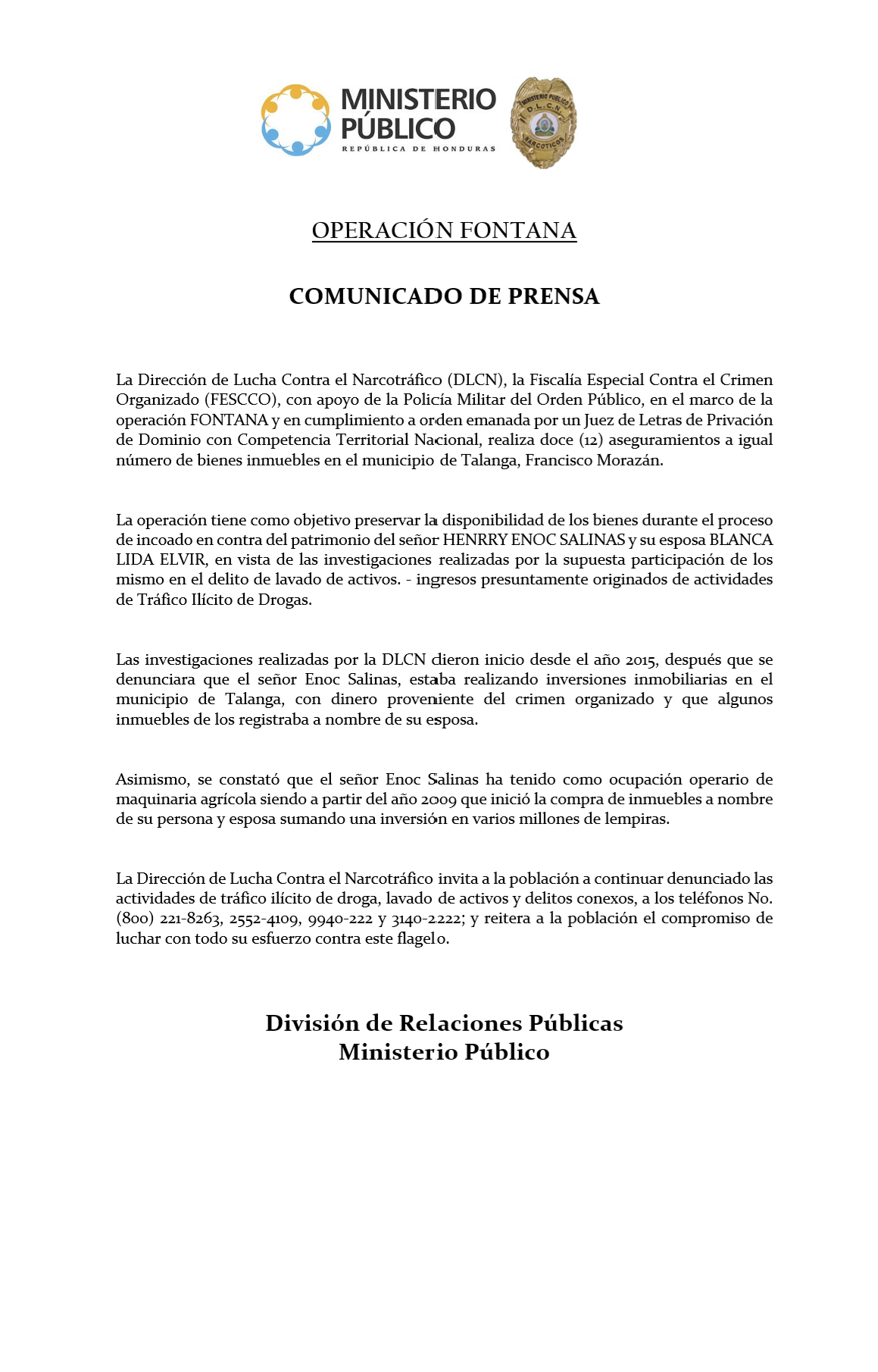 La Dirección de Lucha Contra el Narcotráfico (DLCN), la Fiscalía Especial Contra el Crimen Organizado (FESCCO), con apoyo de la Policía Militar del Orden Público, en el marco de la operación FONTANA y en cumplimiento a orden emanada por un Juez de Letras de Privación de Dominio con Competencia Territorial Nacional, realiza doce (12) aseguramientos a igual número de bienes inmuebles en el municipio de Talanga, Francisco Morazán.