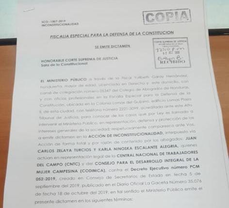 El Ministerio Público, en representación, defensa y protección de los intereses generales de la sociedad emite dictamen para que se declare con lugar la Acción de Inconstitucionalidad interpuesta por la Central Nacional de Trabajadores del Campo (CNTC) y el Consejo para el Desarrollo Integral de la Mujer Campesina (CODIMCA), contra el Decreto Ejecutivo número PCM-052-2019 del 5 de septiembre del 2019 mediante el cual se crea el Programa de Desarrollo Agrícola de Honduras adscrito a la Secretaría de Estado en el Despacho de Defensa Nacional.