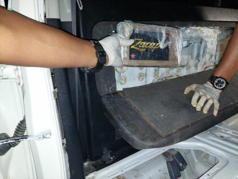 Fue así que, a la altura de la colonia Loarque, específicamente en la posta policial, se logró requerir a los dos automotores y a sus tripulantes, para luego trasladarlos a otro plantel policial, siendo mediante una inspección minuciosa que en uno de los carros se observó en todo el piso de la cabina modificaciones que no son parte de la estructura de fábrica y en el respaldar del asiento de atrás de la cabina se encontró un compartimento falso, tipo caleta, donde ocultaban los cinco paquetes de cocaína, envueltos en plástico trasparente con la leyenda zacapa.
