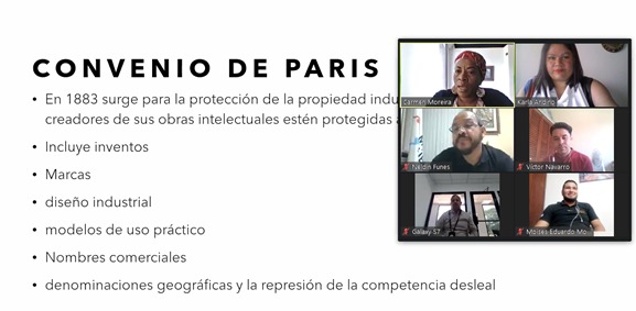 La capacitación virtual tiene una duración de cuatro días y es impartido con el apoyo externo de especialialistas hondureños en Propiedad Intelectual, para este día la abogada Carmen Moreira, quien transmite desde Colombia desarrolla temas sobre Antecedentes de la Propiedad Intelectual y los Tratados Internacionales que Honduras ha ratificado en materia de Propiedad Intelectual.