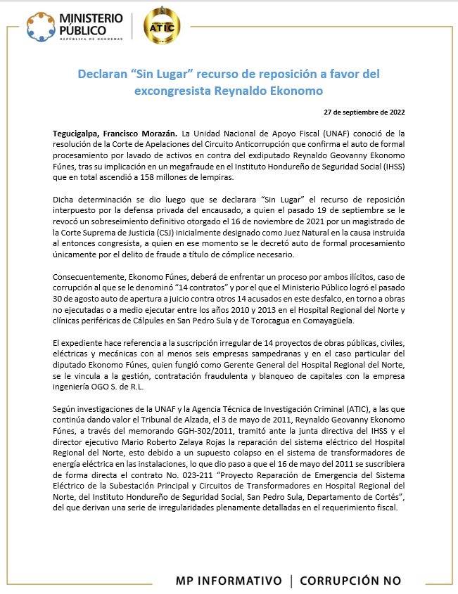 Tegucigalpa, Francisco Morazán. La Unidad Nacional de Apoyo Fiscal (UNAF) conoció de la resolución de la Corte de Apelaciones del Circuito Anticorrupción que confirma el auto de formal procesamiento por lavado de activos en contra del exdiputado Reynaldo Geovanny Ekonomo Fúnes, tras su implicación en un megafraude en el Instituto Hondureño de Seguridad Social (IHSS) que en total ascendió a 158 millones de lempiras.
