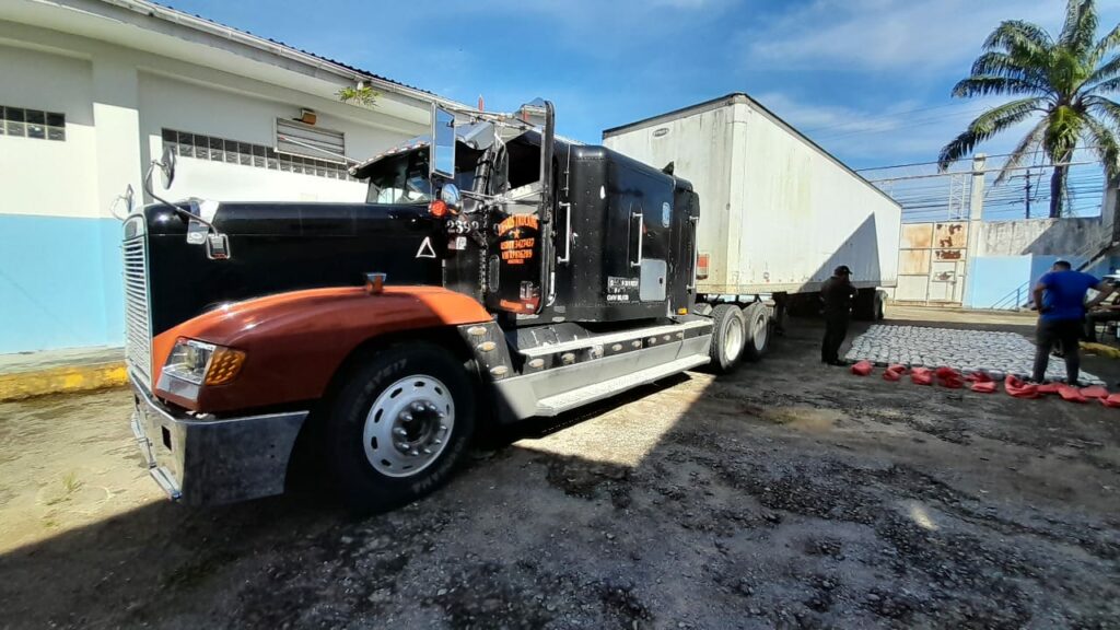 El pesado automotor con placas HBC9261, fue interceptado y trasladado las instalaciones de la DLCN en La Ceiba, donde fue inspeccionado horas más tarde, encontrando en el cajón (con placa TRB1106), un alijo de 755 paquetes dobles embalados con cinta adhesiva (aproximadamente 1,500 libras de hierba seca).
