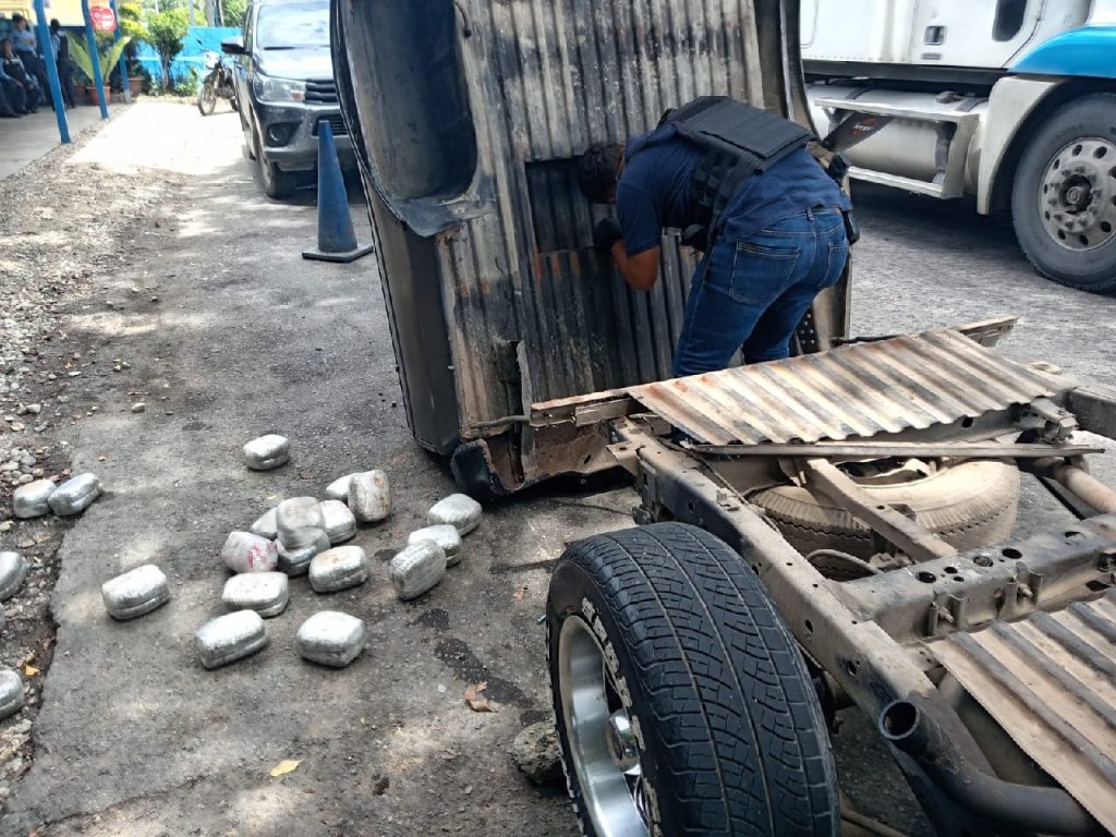 Durante la inspección del vehículo, realizada por agentes de la Dirección Policial de Investigaciones (DPI), se descubrió un doble compartimiento conteniendo 44 paquetes dobles y un paquete sencillo de hierba seca, supuesta marihuana.
