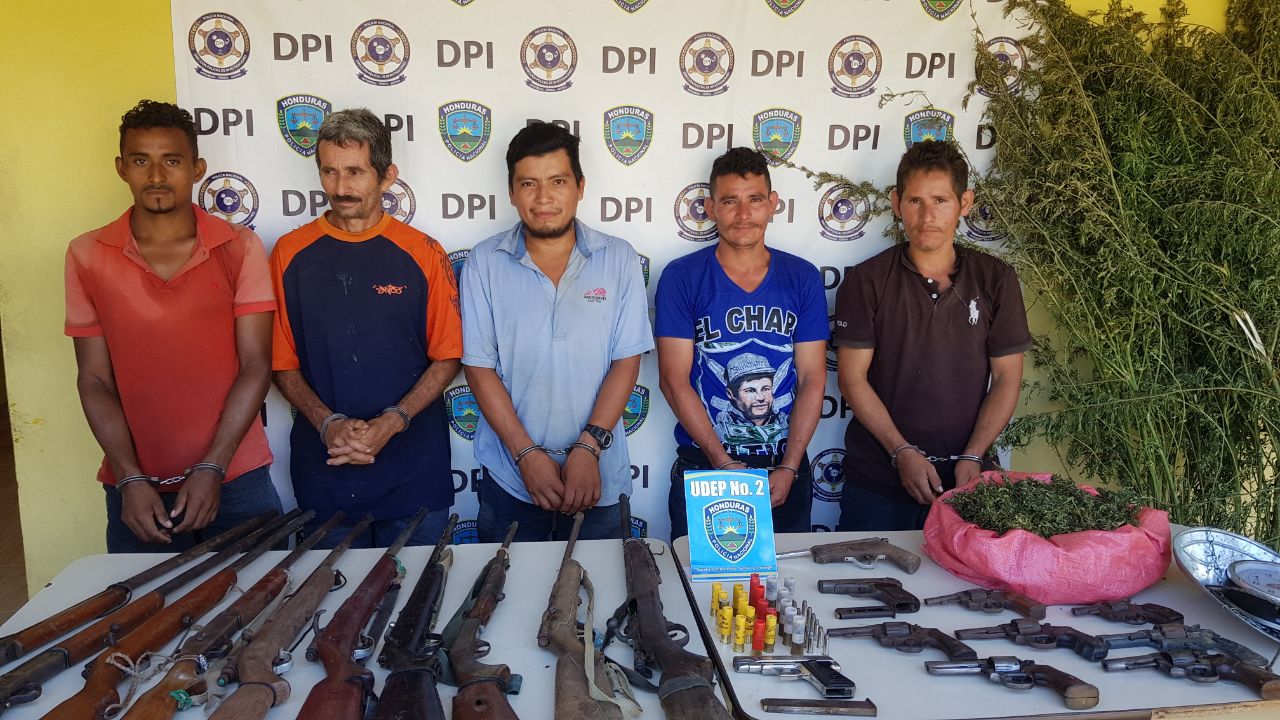 En este operativo se obtuvo la detención de cinco personas, presuntos integrantes de la banda, a quienes se les decomisó 20 armas de fuego de diferentes calibres, un saco conteniendo hierba seca (marihuana) como también un total de 30 plantas de dicha hierba.