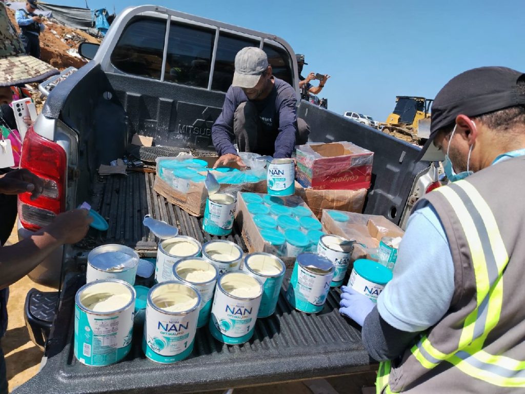 Asimismo, se procedió a la destrucción de 56 latas de leche NAN Optimal Pro, encontradas en un establecimiento comercial. Según las autoridades, la leche estaba vencida, lo cual representaba un riesgo para la salud pública.