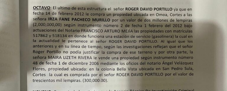 Investigaciones de la FESCCO y la ATIC, vinculan a Portillo Ramírez con la estructura criminal de los Rivera Maradiaga, de hecho, las averiguaciones constataron que no pudo justificar la compra de tres propiedades con un valor total de dos millones trescientos mil lempiras.