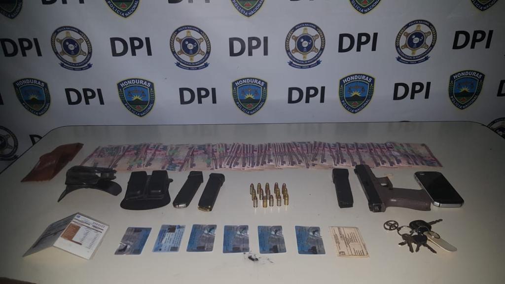 También un arma de fuego marca tipo pistola Glock, tres cargadores, 45 proyectiles, una funda para pistola, un chaleco antibalas de uso comercial, un teléfono celular, documentos de uso personal como identidad, licencias de conducir, carnet de portación de arma de fuego y 52 mil lempiras en billetes de denominación de 500.