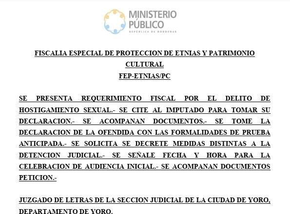 Tras una exhaustiva investigación, la FEP-ETNIAS/PC presentó el requerimiento fiscal y logró que el juez dictara, en la audiencia inicial, el auto de formal procesamiento por el delito de hostigamiento sexual agravado.