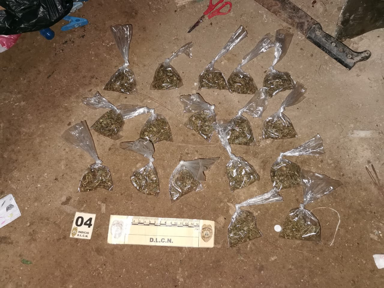 En la acción por parte de los detectives de la DLCN también se decomisó 36 bolsas plásticas transparentes, conteniendo en su interior hierba seca, supuesta marihuana, un teléfono celular y 1,075 lempiras en billetes de diferentes denominaciones.