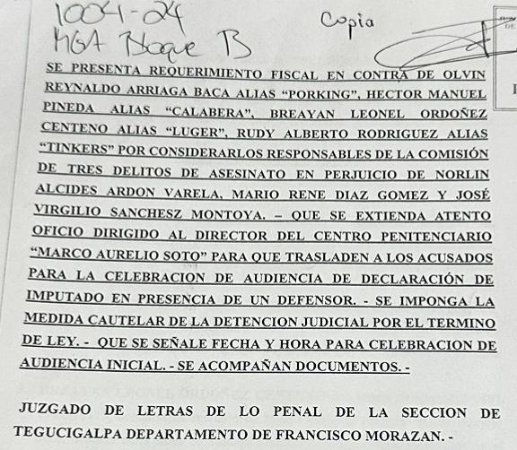 Los acusados son los privados de libertad identificados como: Olvin Reynaldo Arriaga Baca, alias «Porking»; Héctor Manuel Pineda, alias «Calabera»; Breayan Leonel Ordoñez Centeno, alias «Luger» y Rudy Alberto Rodríguez, alias «Tinkers», por considerarlos responsables de la comisión de tres delitos de asesinato en perjuicio de Norlin Alcides Ardón Varela, alias “Lucifer”; Mario René Díaz Gómez, alias “Cuervo” y José Virgilio Sánchez Montoya, alias “Pechocho”.