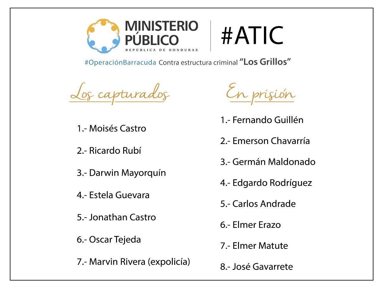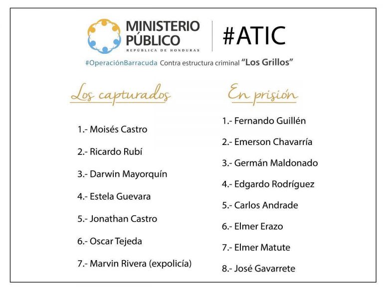 Se trata de Moisés Otoniel Castro Guevara alias “Moisa o Gallo”, Ricardo Rubí, Darwin Josué Mayorquín Carter “alias Monky”, Estela Guevara Portillo alias “La Doña”, Jonathan Josué Castro Guevara alias “Suricato”, Oscar Alfredo Tejeda Obando alias chele “Momo” y el expolicía Marvin Edgardo Rivera Salazar, capturados por la ATIC en el marco de la Operación Barracuda.