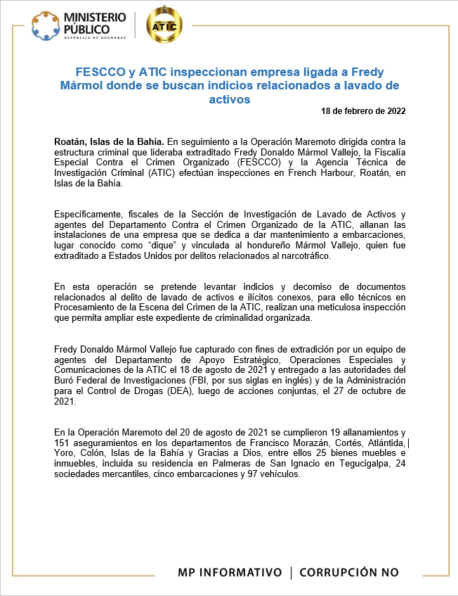 Roatán, Islas de la Bahía. En seguimiento a la Operación Maremoto dirigida contra la estructura criminal que lideraba extraditado Fredy Donaldo Mármol Vallejo, la Fiscalía Especial Contra el Crimen Organizado (FESCCO) y la Agencia Técnica de Investigación Criminal (ATIC) efectúan inspecciones en French Harbour, Roatán, en Islas de la Bahía.