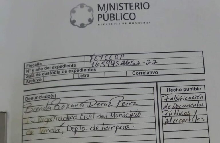 Ante estos hechos la FETCCOP de Santa Rosa de Copán presentó requerimiento fiscal contra la exregistradora Deras Pérez por suponerla responsable del delito de falsificación de documentos públicos.