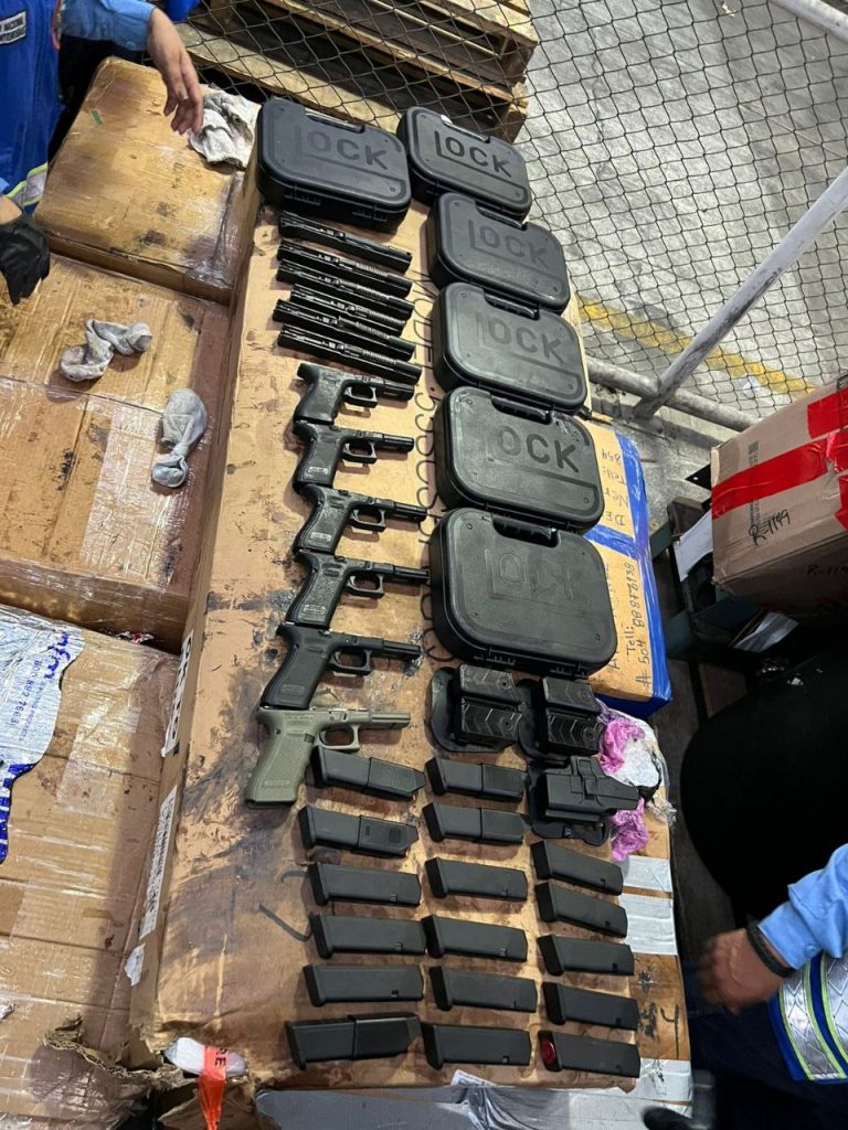 En la revisión del contenedor se encontraron una escopeta marca Tokarev calibre 12 milímetro, una pistola marca Sig Suaer calibre 38, una pistola marca Smith y Wesson y una pistola de la marca Glock calibre 9 milímetro, para un total de nueve armas de fuego. Además, los equipos especializados en realizar las inspecciones, encontraron 132 proyectiles para fusil calibre 2.32, 150 proyectiles calibre 9mm, 25 proyectiles calibre 12mm y 170 proyectiles calibre 22 Sig Suaer, para un total de 477 proyectiles.