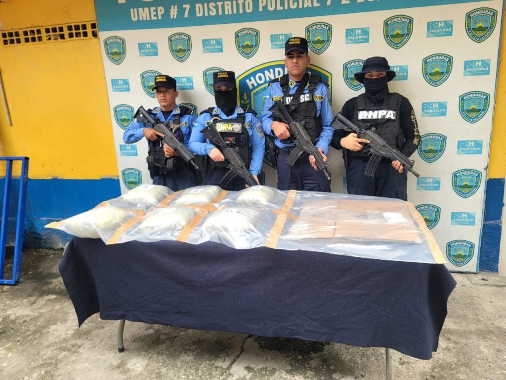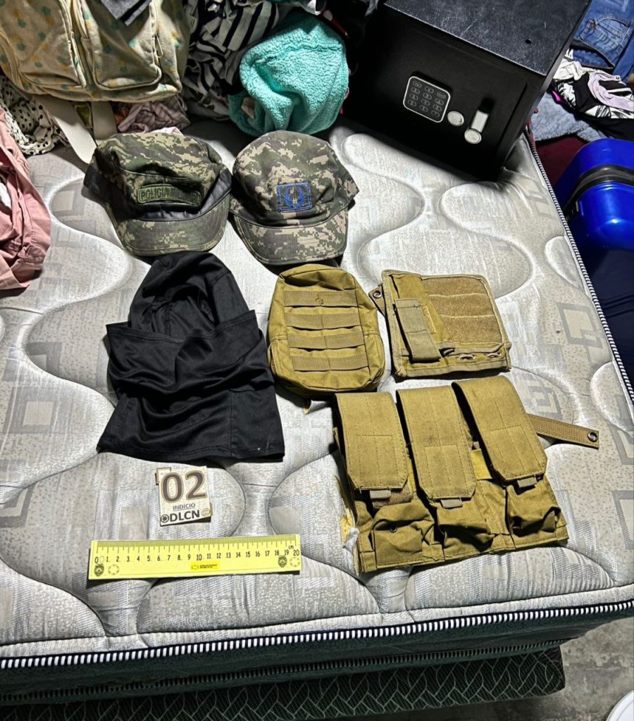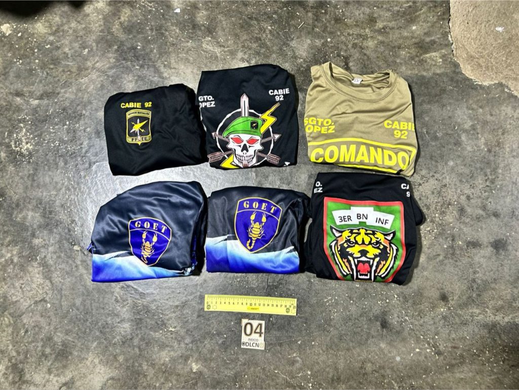 Además, se le decomisó una gorra con la escritura de la Policía Militar del Orden Público (PMOP) y una segunda con el nombre de la Fuerza Aérea Hondureña (FAH) y ocho camisetas con la escritura del Grupo de Operaciones Especiales Táctico (GOET), del Tercer Batallón de Infantería y del Comando Especial de los Cobras, insignias de la Dirección de Lucha Contra el Narcotráfico (DLCN) y hasta un fusil R-15.