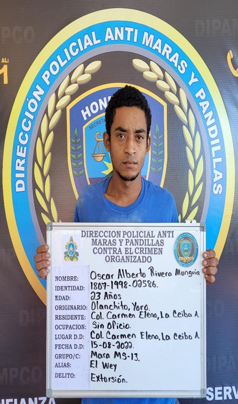 Este individuo, mediante intimidación y amenazas a muerte, le exigió al testigo protegido pagar la cantidad de tres mil lempiras a partir del 15 de agosto de 2022 en un sector de la colonia Carmen Elena de La Ceiba, donde fue detenido con el sobre que contenía billetes seriados.