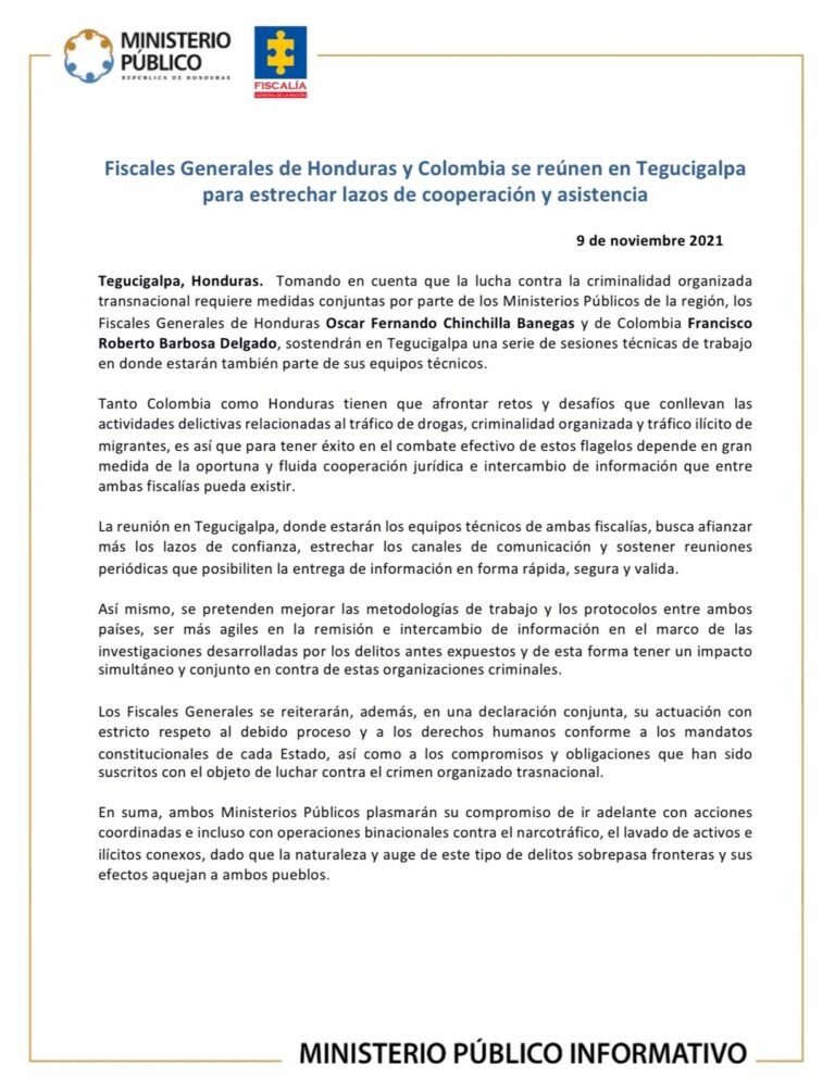 La reunión en Tegucigalpa, donde estarán los equipos técnicos de ambas fiscalías, busca afianzar más los lazos de confianza, estrechar los canales de comunicación y sostener reuniones periódicas que posibiliten la entrega de información en forma rápida, segura y valida.