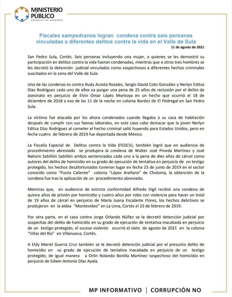 Una de las condenas es contra Rudy Acosta Rosales, Sergio David Coto González y Nerlyn Editza Díaz Rodríguez cada uno de ellos va purgar una pena de 25 años de reclusión por el delito de asesinato en perjuicio de Elvin Omar López Montoya en un hecho que ocurrió el 18 de diciembre de 2018 a eso de las 11 de la noche en colonia Bordos de El Pedregal en San Pedro Sula.