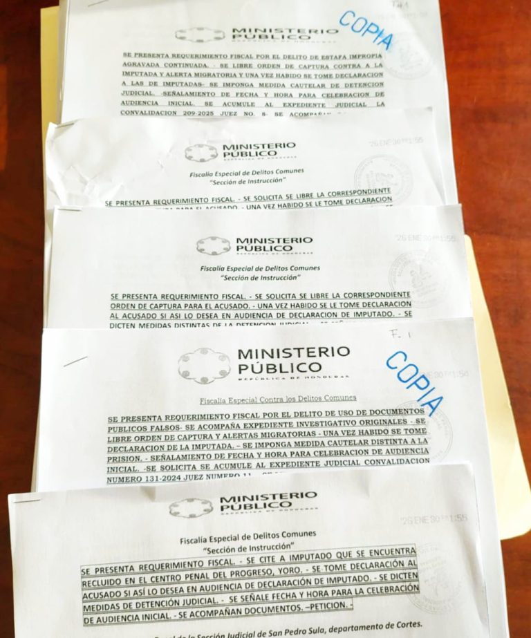 La Fiscalía presentó requerimientos fiscales contra Santos Alejandro Zapata por el delito de homicidio imprudente grave en perjuicio de Keneth Yadir Sabillón García, así como contra Iris Jackelin Montoya Martínez por estafa impropia agravada continuada. De igual manera, contra Brillan Josué Duarte Cáceres por homicidio imprudente grave y omisión del deber del socorro en perjuicio de Roxana Claribel Mendoza Reyes y Santos Buenos Mendoza Alvarenga. Asimismo, se formalizaron acusaciones contra Victoria Alejandra Peña Guzmán por uso de documentos públicos falsos y contra Carlos Alberto Mejía Altamirano por estafa impropia.