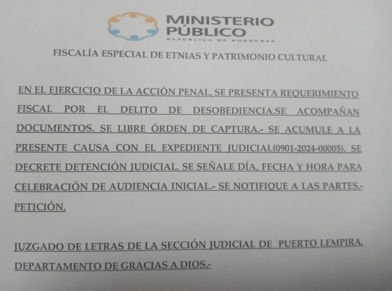 Puerto Lempira, Gracias a Dios. – La Fiscalía Especial de Protección a las Etnias y Patrimonio Cultural (FEP-ETNIAS/PC), presentó requerimiento fiscal en contra de Herlan Alexi Ramos Lanza, por suponerlo responsable del delito de desobediencia en perjuicio del orden público.