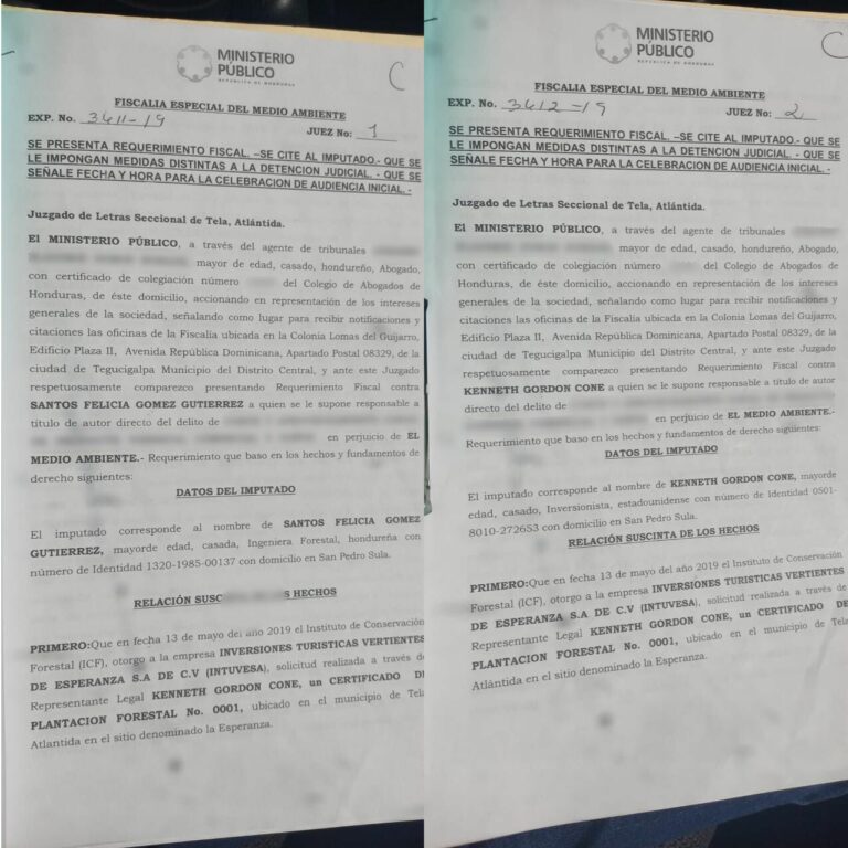 Tegucigalpa, Francisco Morazán. – Por medio de prueba científica más un buen manejo de la investigación, la Fiscalía Especial de Medio Ambiente (FEMA), obtiene auto de formal procesamiento en contra de Kenneth Gordon Cone y Santos Felicia Gómez Gutiérrez, por suponerles responsables de cometer el delito de explotación ilegal de recursos naturales agravado en perjuicio del equilibrio del ecosistema.