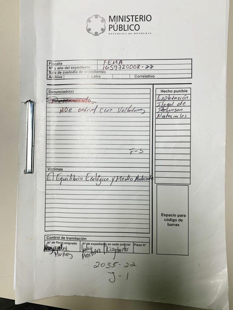 Tegucigalpa, Francisco Morazán. – Por medio de la interposición de una denuncia del Instituto de Conservación Forestal (ICF), la Fiscalía Especial de Medio Ambiente (FEMA), obtiene auto de formal de procesamiento con medidas, contra Noé Gabriel Cruz Valladares por la comisión del delito de explotación ilegal de recursos naturales.