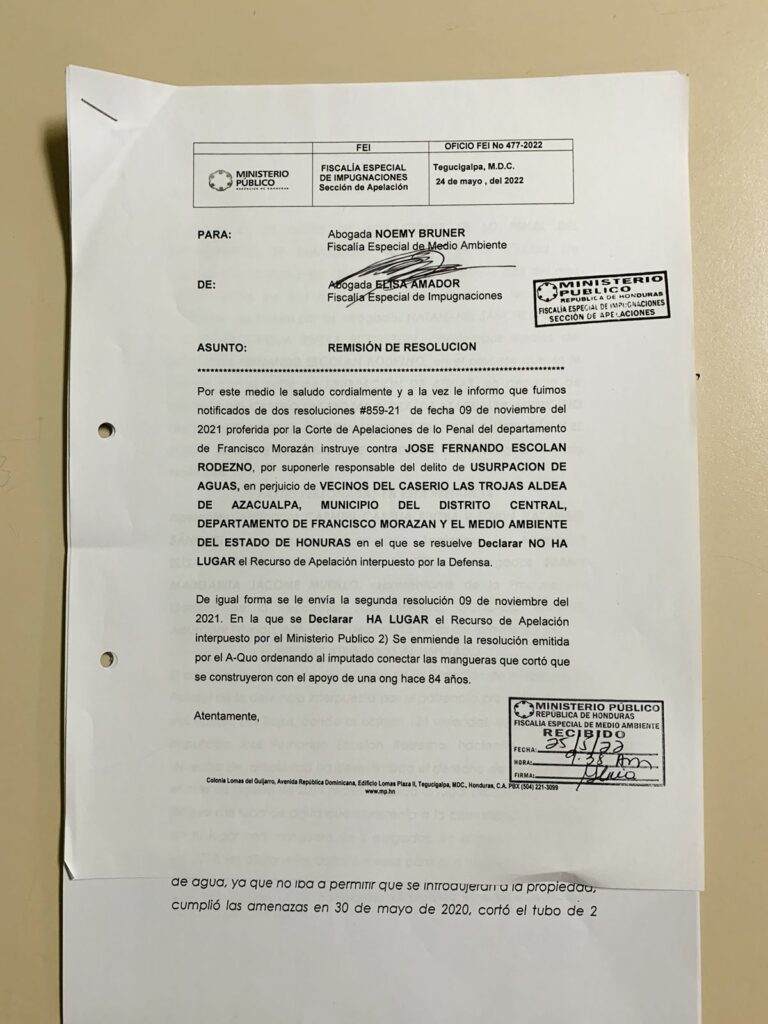 Tegucigalpa, Francisco Morazán. – En el accionar de la “Operación Némesis V” y tras presentar un recurso de apelación, la Fiscalía Especial de Medio Ambiente (FEMA), obtiene resolución favorable a los pobladores del caserío “Las Trojes”, quienes no contaban con servicio de agua potable por decisión arbitraria tomada por el vecino José Escalón Rodezno.