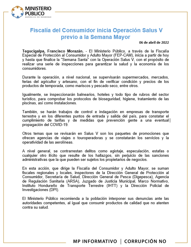 Tegucigalpa, Francisco Morazán.– El Ministerio Público, a través de la Fiscalía Especial de Protección al Consumidor y Adulto Mayor (FEP-CAM), inicia a partir de hoy y hasta que finalice la «Semana Santa» con la Operación Salus V, con el propósito de realizar una serie de inspecciones para garantizar la salud y la economía de los consumidores.