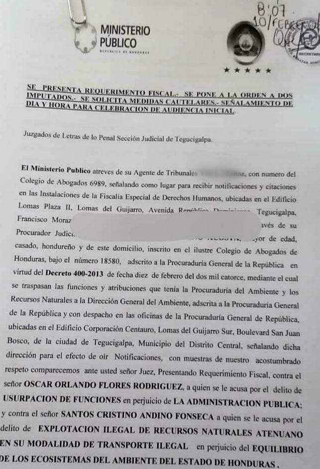 Tegucigalpa, Francisco Morazán. – La Fiscalía Especial de Medio Ambiente (FEMA), presentó requerimiento fiscal por la comisión del delito de explotación ilegal de recursos naturales en su modalidad de transporte ilegal, contra Oscar Flores Rodríguez, a quien luego de realizar una inspección rutinaria por una denuncia presentada ante la fiscalía, se le detuvo de forma infraganti.