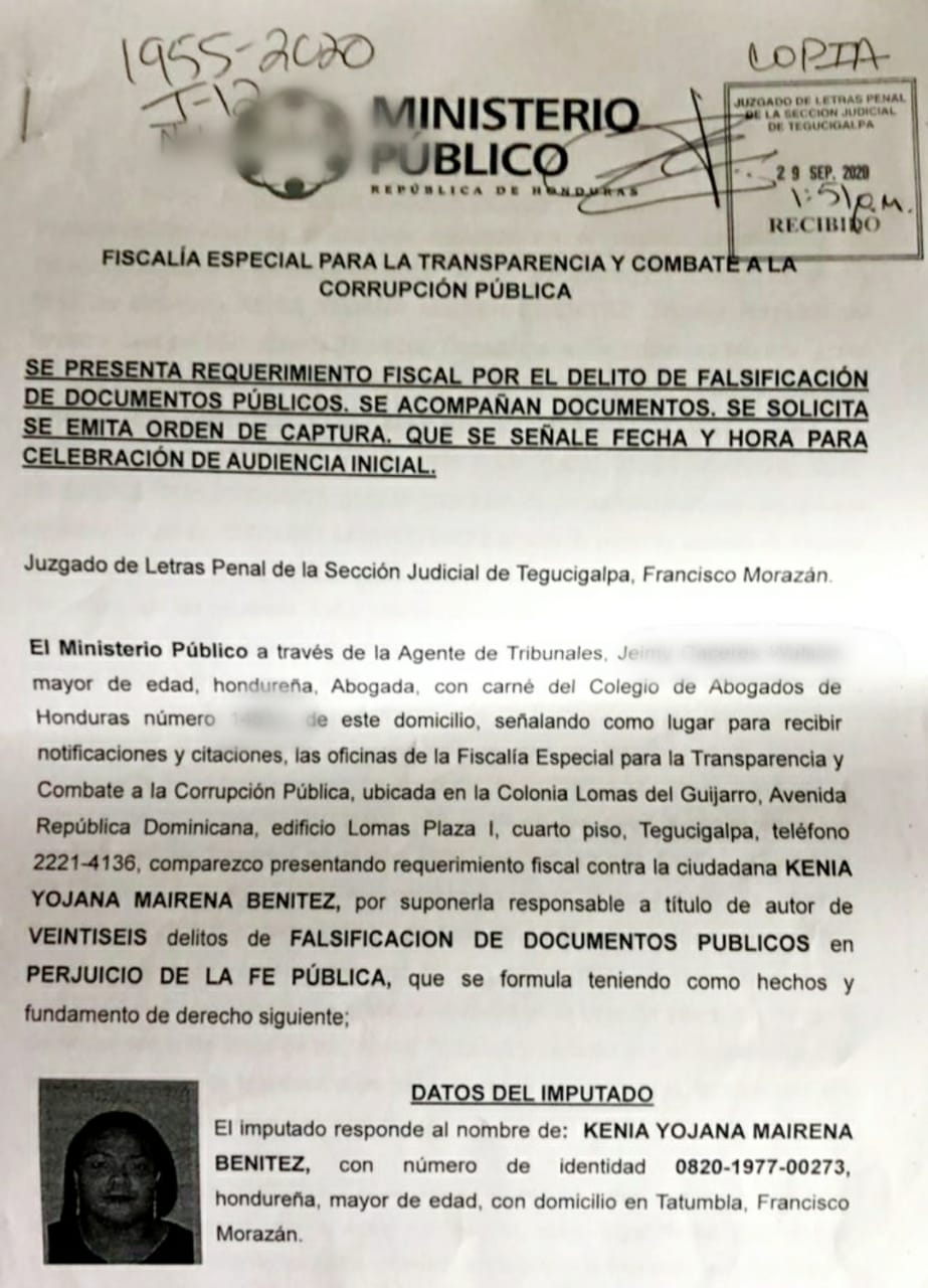 Tegucigalpa, Francisco Morazán. – En el marco de la Operación Júpiter III, la Fiscalía Especial para la Transparencia y Combate a la Corrupción Pública (FETCCOP), presenta requerimiento fiscal por falsificación de documentos públicos contra Kenia Mairena Benítez, técnico del Registro Civil, del municipio de Tatumbla. La Funcionaría, fue detenida por agentes de la Agencia Técnica de Investigación Criminal (ATIC) y será presentada ante juez competente en las próximas horas.