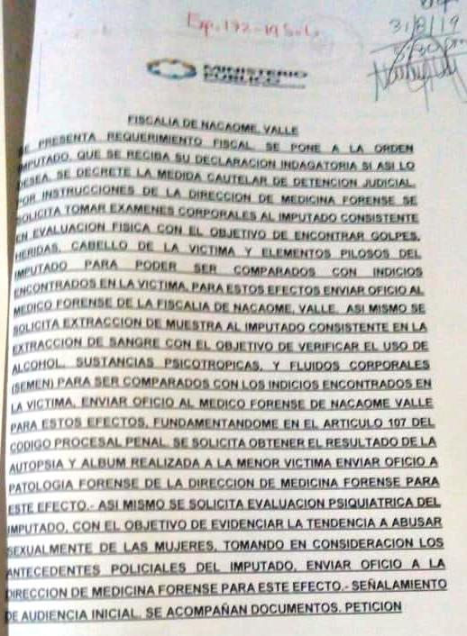 San Lorenzo, Valle. Fiscalía Local de San Lorenzo, Valle, presenta Requerimiento Fiscal contra José Hernández Ávila (30), por suponerle responsable de la comisión del delito de asesinato contra un menor de edad, hecho que conmocionó a la comunidad donde se dio el hecho.