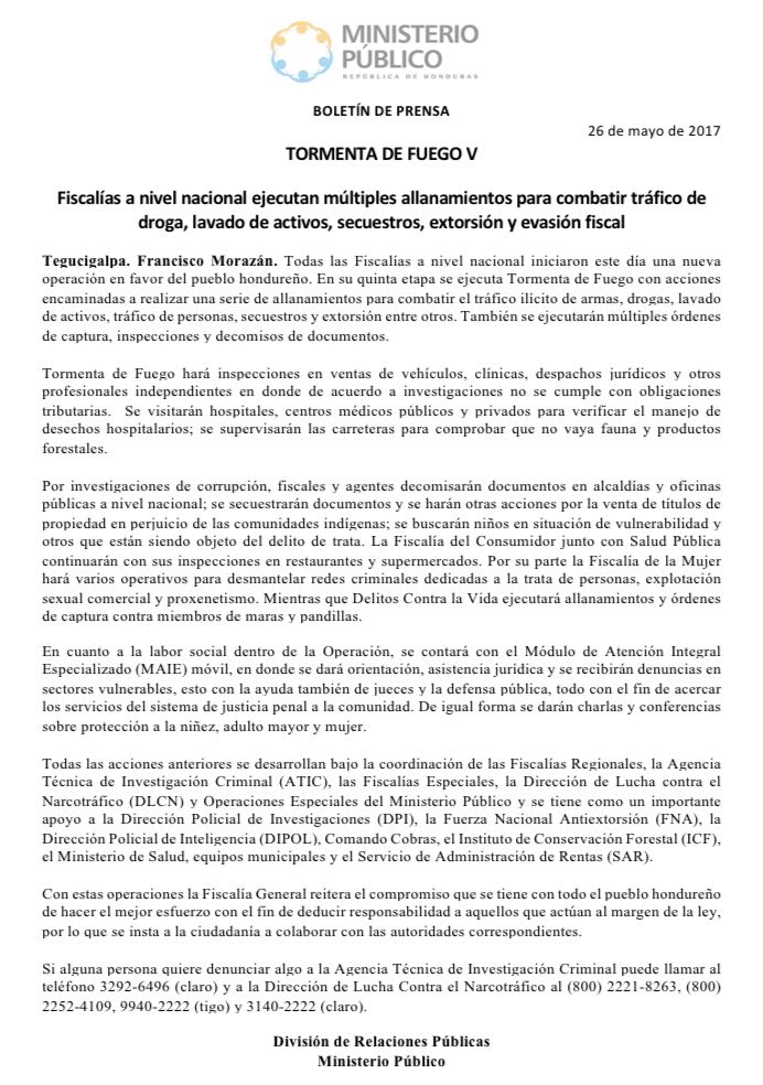 Tegucigalpa. Francisco Morazán. Todas las Fiscalías a nivel nacional iniciaron este día una nueva operación en favor del pueblo hondureño. En su quinta etapa se ejecuta Tormenta de Fuego con acciones encaminadas a realizar una serie de allanamientos para combatir el tráfico ilícito de armas, drogas, lavado de activos, tráfico de personas, secuestros y extorsión entre otros. También se ejecutarán múltiples órdenes de captura, inspecciones y decomisos de documentos.