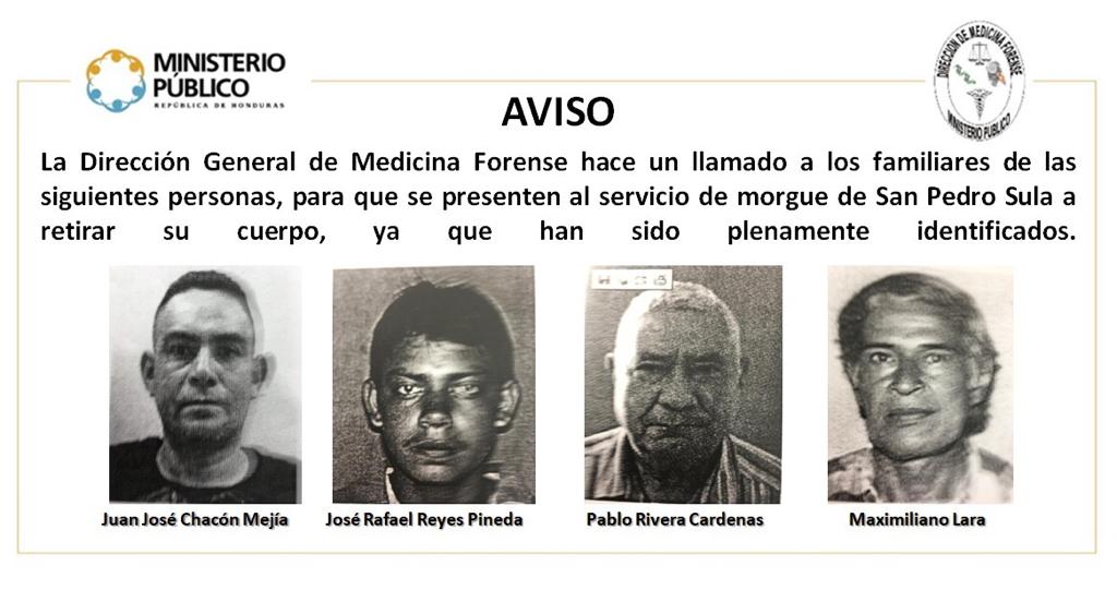 Forenses de SPS hacen llamado a familiares de cuatro personas fallecidas cuyos cuerpos no han sido reclamados