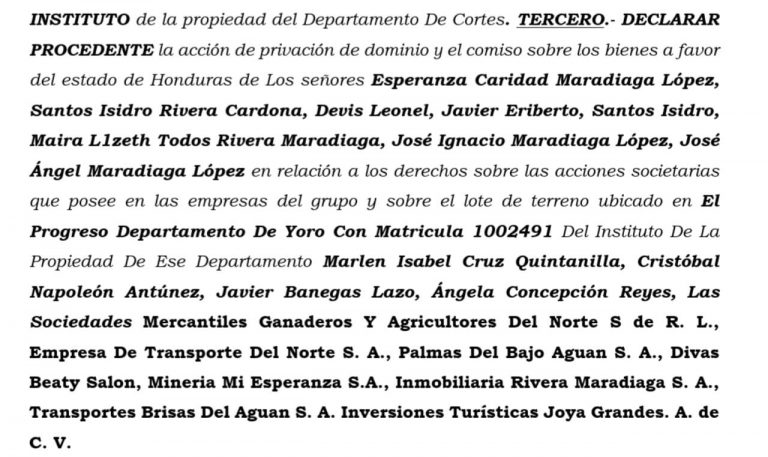 Es así, que se declara procedente la acción de privación de dominio y el comiso sobre los bienes a favor del Estado de Honduras de los ciudadanos Esperanza Caridad Maradiaga López, Santos Isidro Rivera Cardona y Devis Leonel, Javier Eriberto, Santos Isidro, Maira Lizeth todos de apellido Rivera Maradiaga, José Ignacio Maradiaga López y José Ángel Maradiaga López, en relación a los derechos y las acciones societarias que éstos poseen en las empresas del grupo y además sobre un lote de terreno ubicado en El Progreso, departamento de Yoro, con matrícula 1002491 del Instituto de la Propiedad.