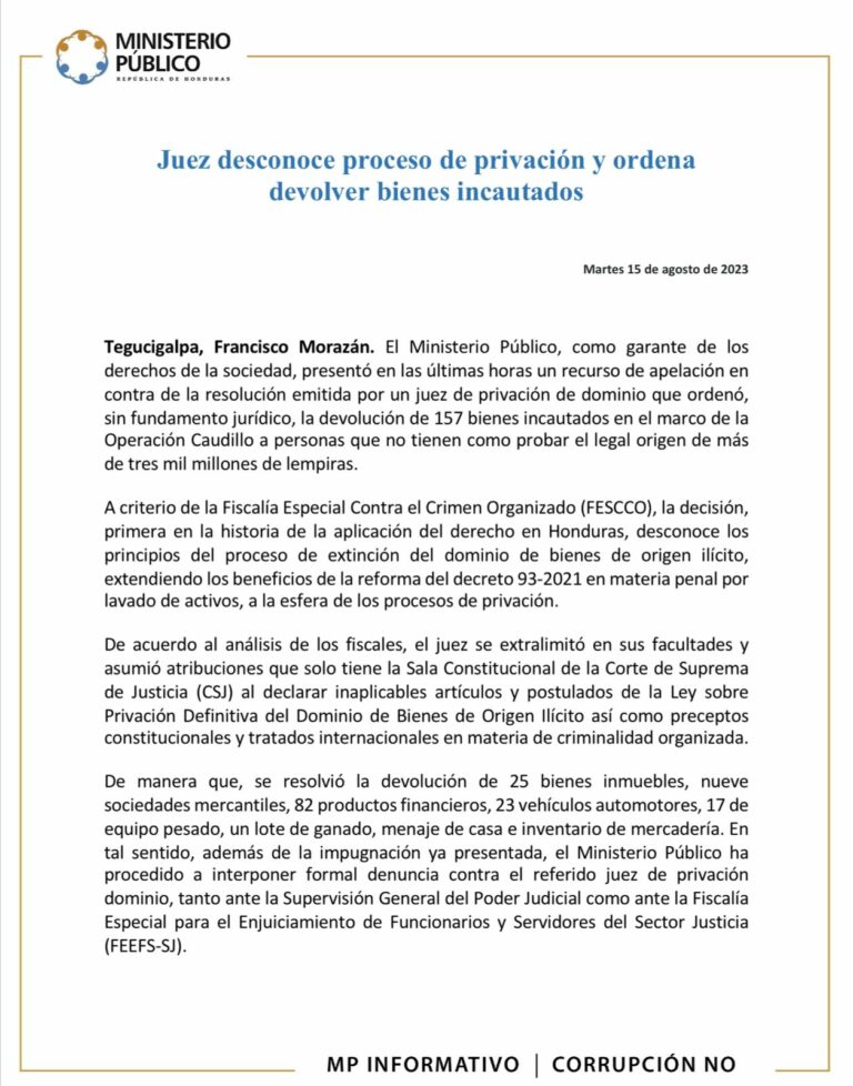 Tegucigalpa, Francisco Morazán. El Ministerio Público, como garante de los derechos de la sociedad, presentó en las últimas horas un recurso de apelación en contra de la resolución emitida por un juez de privación de dominio que ordenó, sin fundamento jurídico, la devolución de 157 bienes incautados en el marco de la Operación Caudillo a personas que no tienen como probar el legal origen de más de tres mil millones de lempiras.