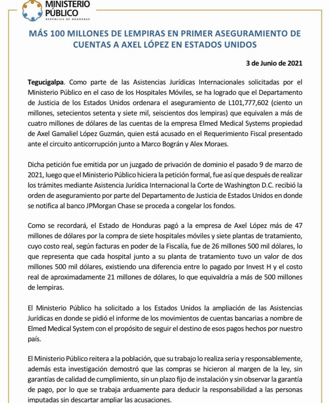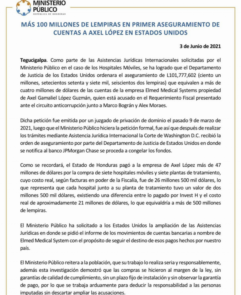 Tegucigalpa. Como parte de las Asistencias Jurídicas Internacionales solicitadas por el Ministerio Público en el caso de los Hospitales Móviles, se ha logrado que el Departamento de Justicia de los Estados Unidos ordenara el aseguramiento de L101,777,602 (ciento un millones, setecientos setenta y siete mil, seiscientos dos lempiras) que equivalen a más de cuatro millones de dólares de las cuentas de la empresa Elmed Medical Systems propiedad de Axel Gamaliel López Guzmán, quien está acusado en el Requerimiento Fiscal presentado ante el circuito anticorrupción junto a Marco Bográn y Alex Moraes.