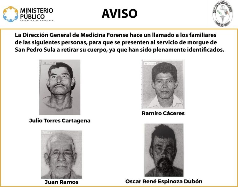 Los familiares de los anteriores ciudadanos pueden pasar en horas de oficina de 8:00 de la mañana a 4:00 de la tarde por las oficinas de Medicina Forense en San Pedro Sula, para hacerles entrega de los cuerpos de sus parientes.