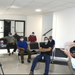 La charla fue impartida en dos grupos para garantizar el distanciamiento social, recalcando que esa medida debe ser un comportamiento necesario tanto entre compañeros como al recibir a los usuarios, además del uso permanente de mascarilla y las otras medidas explicadas durante la capacitación.