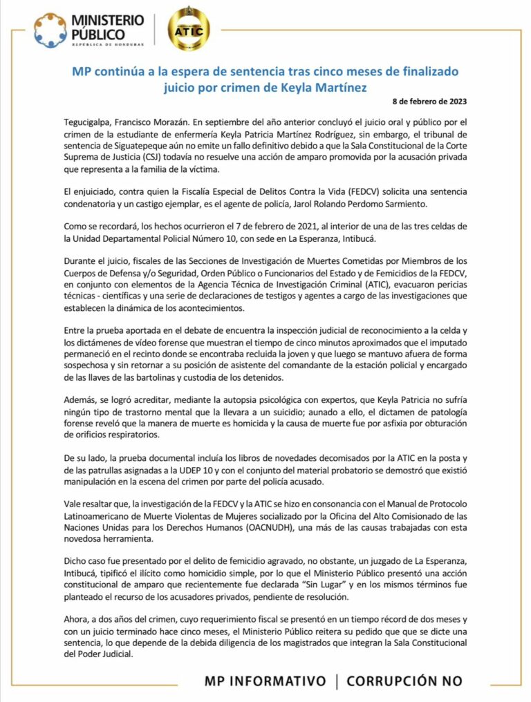 Tegucigalpa, Francisco Morazán. En septiembre del año anterior concluyó el juicio oral y público por el crimen de la estudiante de enfermería Keyla Patricia Martínez Rodríguez, sin embargo, el tribunal de sentencia de Siguatepeque aún no emite un fallo definitivo debido a que la Sala Constitucional de la Corte Suprema de Justicia (CSJ) todavía no resuelve una acción de amparo promovida por la acusación privada que representa a la familia de la víctima.