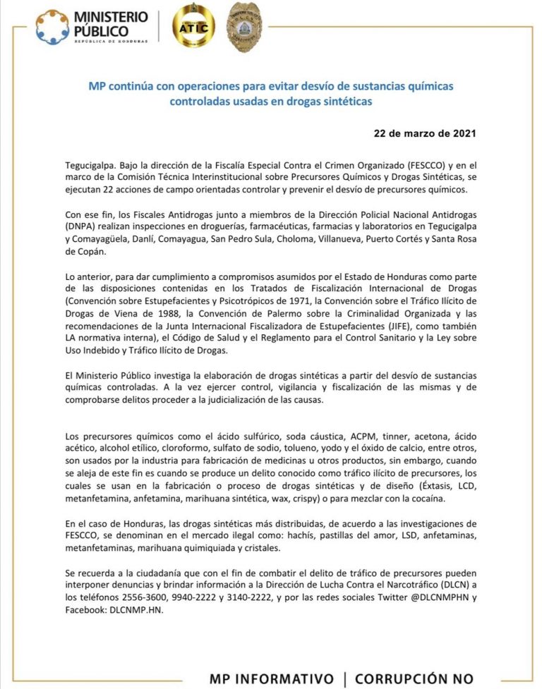 Se recuerda a la ciudadanía que con el fin de combatir el delito de tráfico de precursores pueden interponer denuncias y brindar información a la Dirección de Lucha Contra el Narcotráfico (DLCN) a los teléfonos 2556-3600, 9940-2222 y 3140-2222, y por las redes sociales Twitter @DLCNMPHN y Facebook: DLCNwww.mp.hn.